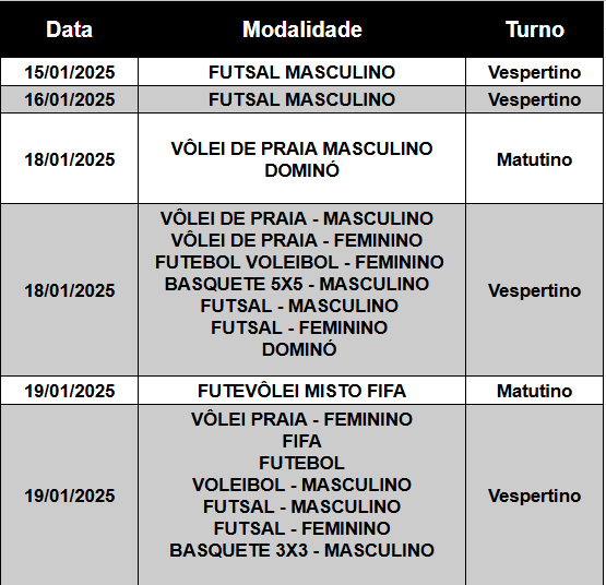 O calendário que já estava prejudicado em função da greve do último ano, sofreu  mudanças com o intuito de viabilizar que o final dos Jogos Internos acabem na data prevista, 15 de fevereiro. A última versão do calendário conta com as datas atualizadas dos jogos adiados no último final de semana, que começam neste dia 15. Vale lembrar que o futebol ocorreu normalmente nos dias 11 e 12.  Acompanhe abaixo os jogos que foram reprogramados para essa semana: